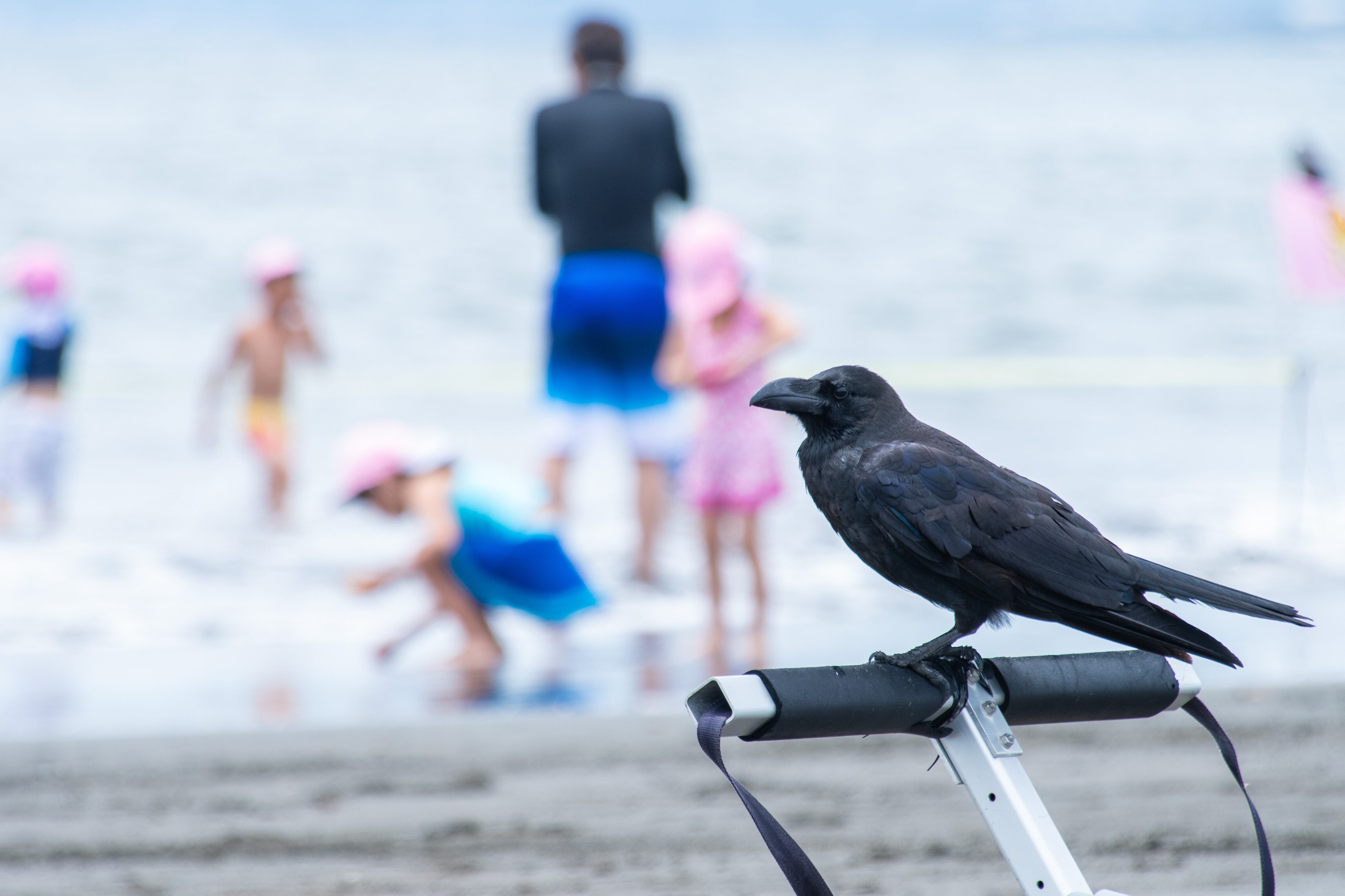 この作品は海水浴客に混じり海を眺めているカラスを撮影しました。後ろに映った子供たちの笑い声や海のさざなみが聞こえてきそうな作品になっています。